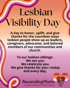 Today we celebrate Lesbian Visibility Day—a day to honor, uplift, and give thanks for the countless ways lesbian people show up as leaders, caregivers, advocates, and beloved members of our communities and church.