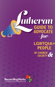 - Lutheran Guide to Advocate for LGBTQIA+ People in Church and Society - This resource is a starting point for you and your Lutheran faith community as it seeks to advocate for lesbian, gay, bisexual, transgender, queer, intersex, and asexual/aromantic (LGBTQIA+) people in church and society. It is ReconcilingWorks’ hope that tools and answers in this guide will give your community the boldness to proclaim Christ’s gospel of radical inclusion and hospitality to your neighbors, our church, and our world. Christ and Lutherans are called to care for everyone, against discrimination and marginalization, and work for justice.