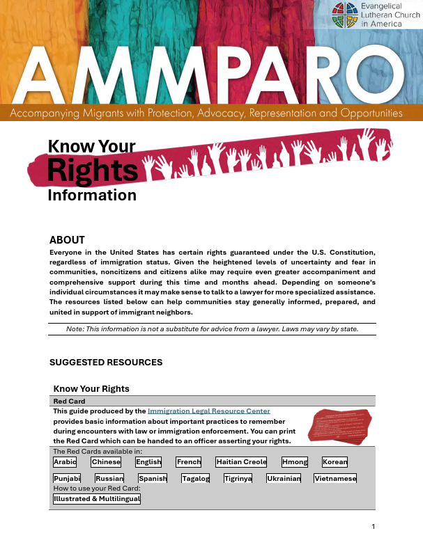 Everyone in the United States has certain rights guaranteed under the U.S. Constitution, regardless of immigration status. Given the heightened levels of uncertainty and fear in communities, noncitizens and citizens alike may require even greater accompaniment and comprehensive support during this time and months ahead. Depending on someone’s individual circumstances it may make sense to talk to a lawyer for more specialized assistance. Know Your Rights 2025 resources can help communities stay generally informed, prepared, and united in support of immigrant neighbors. There you will also find printable "Red Cards" providing basic information about important practices to remember during encounters with law or immigration enforcement.