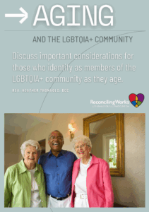 Aging and the LGBTQIA+ Community by Rev. Heather Thonvold, BCC, discusses the important considerations for those who identify as LGBTQIA+ people as they age. This free ReconcilingWorks resource helps accompany family, friends, and caregivers as they navigate conversations around care needs for their loved ones. While walking through documentation, choosing care settings, and legacy planning, this resource can provide the tools needed for these meaningful conversations.