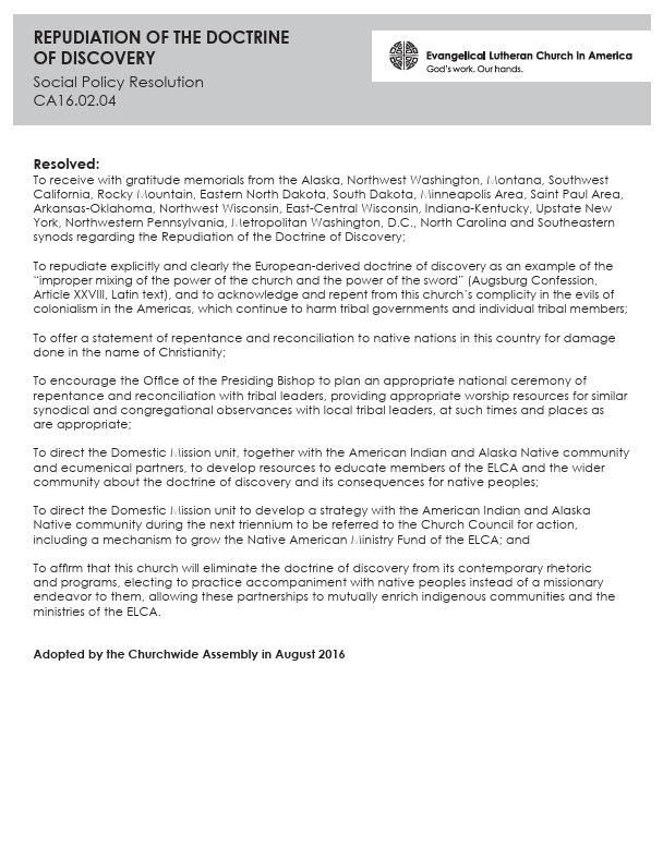 “To repudiate explicitly and clearly the European-derived doctrine of discovery as an example of the ‘improper mixing of the power of the church and the power of the sword’ (Augsburg Confession Article XXVIII, Latin text), and to acknowledge and repent from this church’s complicity in the evils of colonialism in the Americas, which continue to harm tribal governments and individual tribal members.”